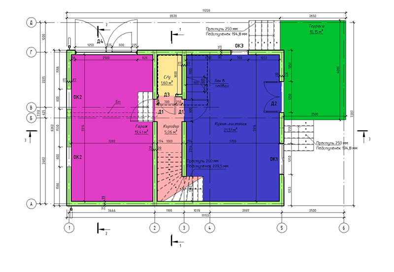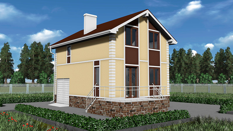 Фундамент — деревянный ростверк на винтовых сваях, монолитная плита под гараж.